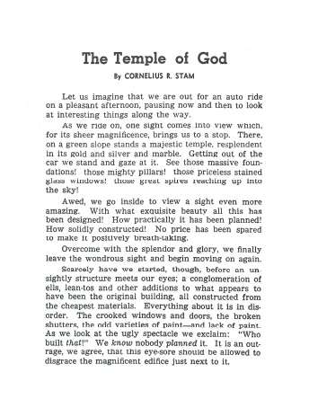 The topic of this booklet is the Church, the body of true believers, which is the perfect work of God. While God has made believers His flawless Temple, we must be careful to build upon our solid foundation, the Lord Jesus Christ, by believing and teaching the Word of God, according to the revelation of the Mystery, committed to the Apostle Paul.